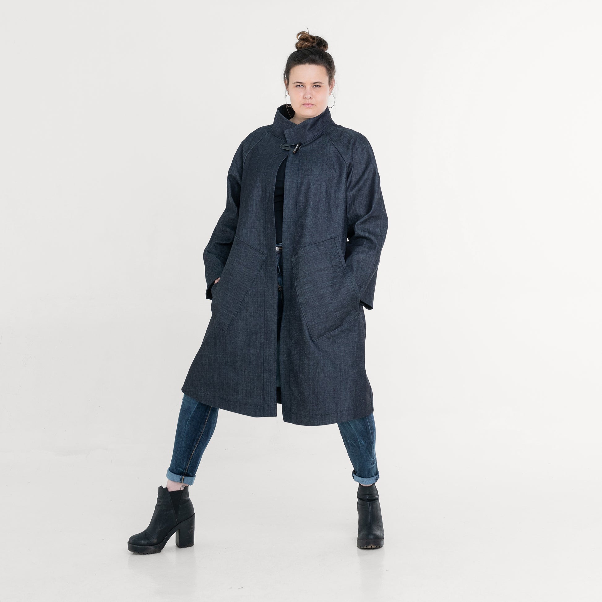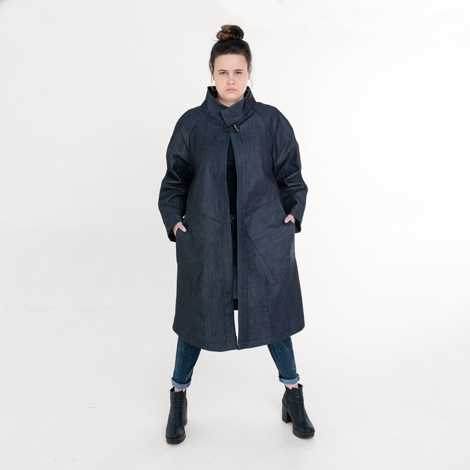Raglan sleeve oversized denim trench coat. Comes with a belt.